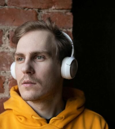 A person stands in front of a row of industrial-grade dryers in a dimly lit laundromat. The machines are beige with dark-tinted glass, and the one in use shows clothes tumbling inside. The walls are plain and the environment gives an impression of quiet solitude.